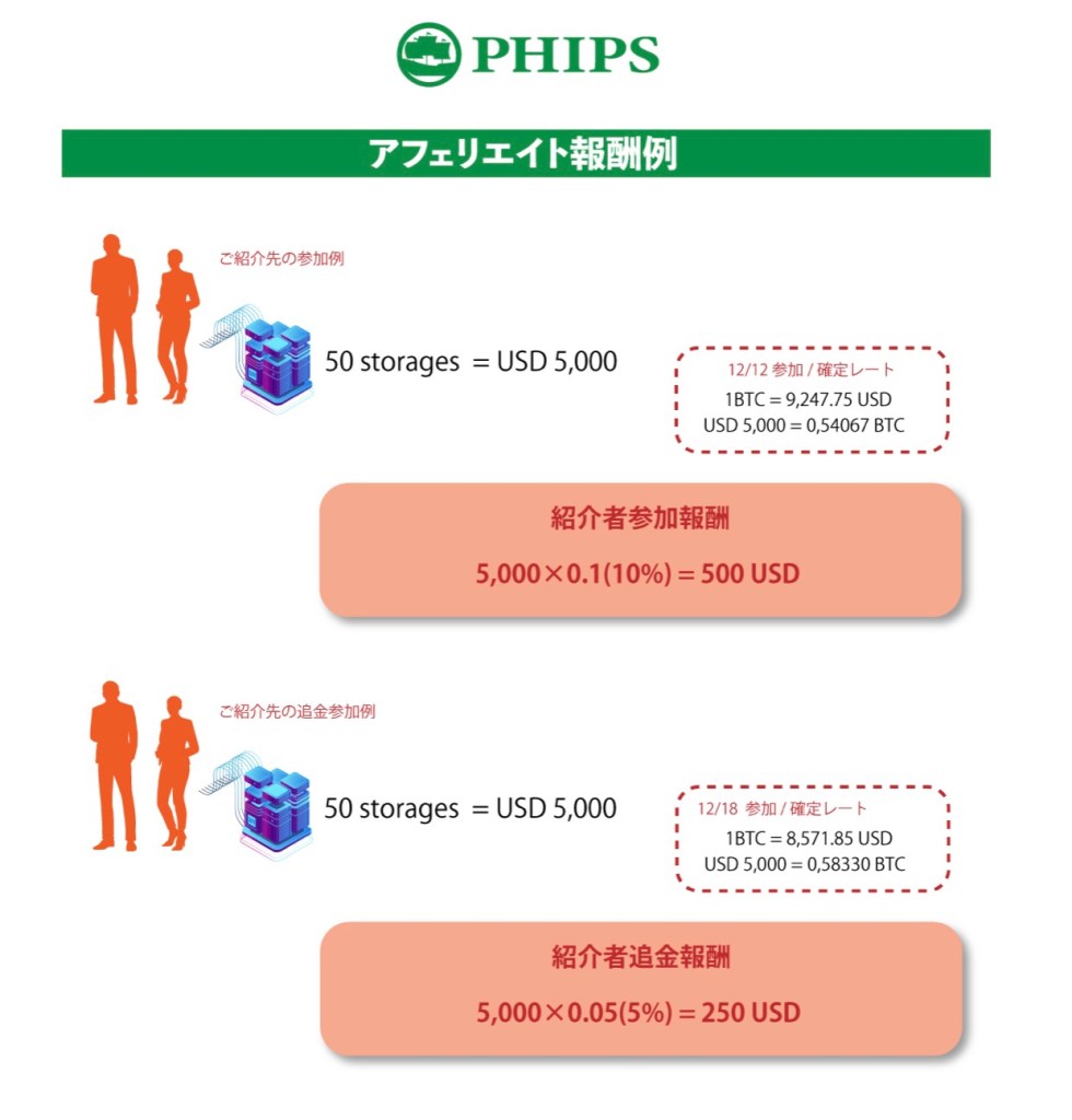例)ご自身が500$で参加→お友達にPHIPSの事を言ったらやりたいと言われ そのお友達は5000$で参加→10%がコミッションとして入るので 500$入る→翌週にはBTC出金→元金回収❣️